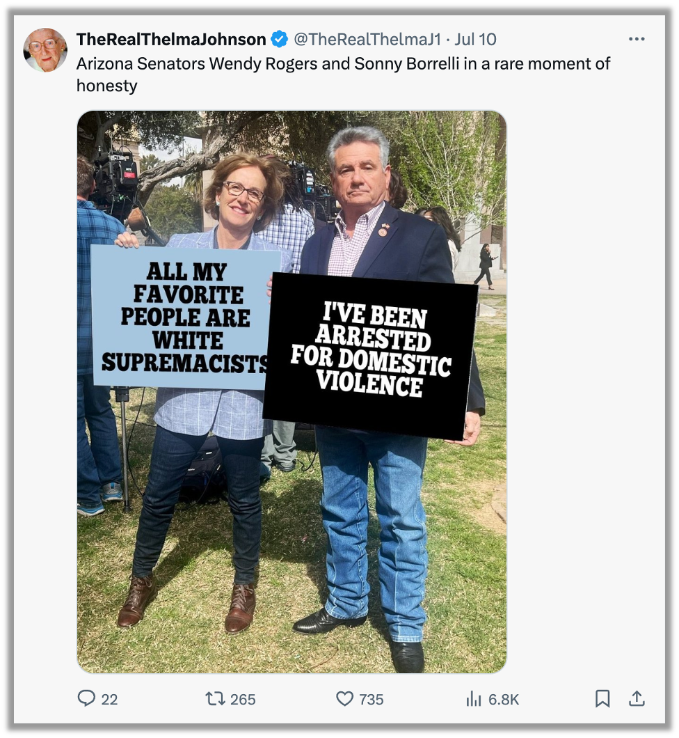 In terms of who is the worst, think about it, it's an impossible decision: Sonny Borrelli, Anthony Kern, Wendy Rogers, Justine Wadsack, Rachel Jones, Warren Petersen, Joe Chaplik, Shawnna Bolick... It's like trying to choose your favorite natural disaster.