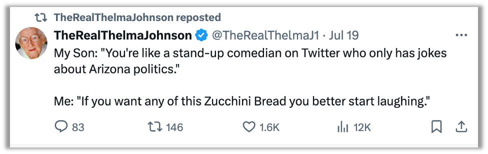 What? You don’t follow Arizona’s MeeMaw on Twitter? You’re missing so much fun, so much pointed commentary, and—soon—a great zucchini bread recipe! We caught up with Thelma and are excited to publish the following Q&A: