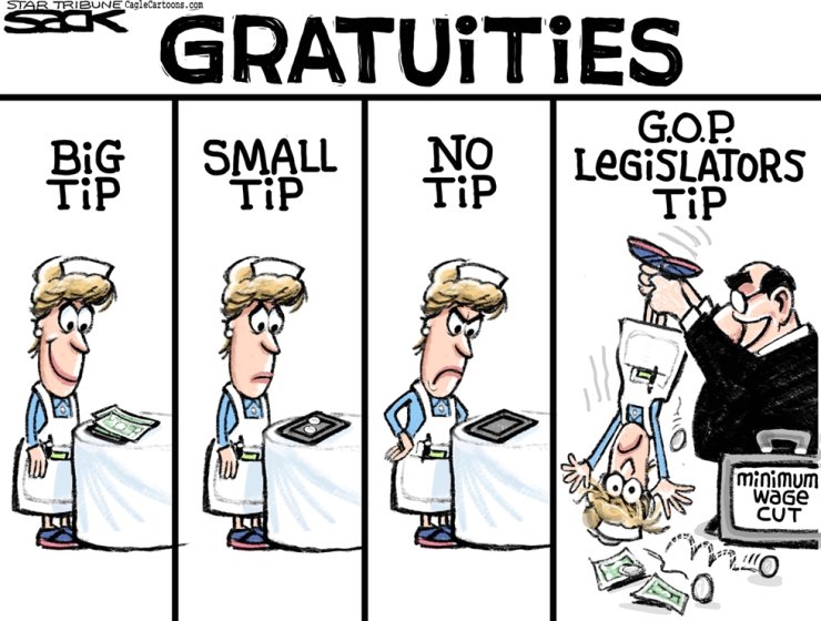 Hurts tipped workers. Current state law allows restaurants to pay tipped workers $3/hr less than minimum wage, assuming that workers will get up to minimum wage with workers' tips. With current minimum wage set at $14.35, that would bring hourly wages down to $10.76 for tipped employees, less than the $11.35 per hour they currently receive. There is no question but that change would financially benefit the restaurants. Unbelievably, the lawmakers behind this measure have dubbed it the "Tipped Workers Protection Act."
