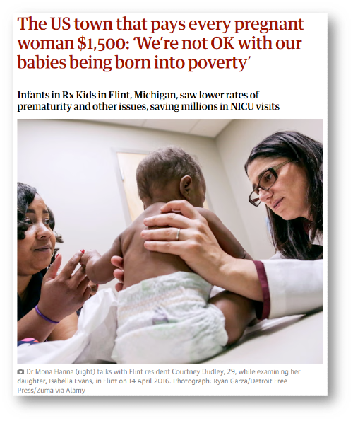 When Angela Sintery first learned about Rx Kids, a program for new mothers in her home town of Flint, Michigan, she thought someone must be trying to scam her. The program promised $1,500 for all expectant mothers during pregnancy and $500 per month for the first year of their infant’s life. All Sintery had to do was upload a copy of her ultrasound and ID.