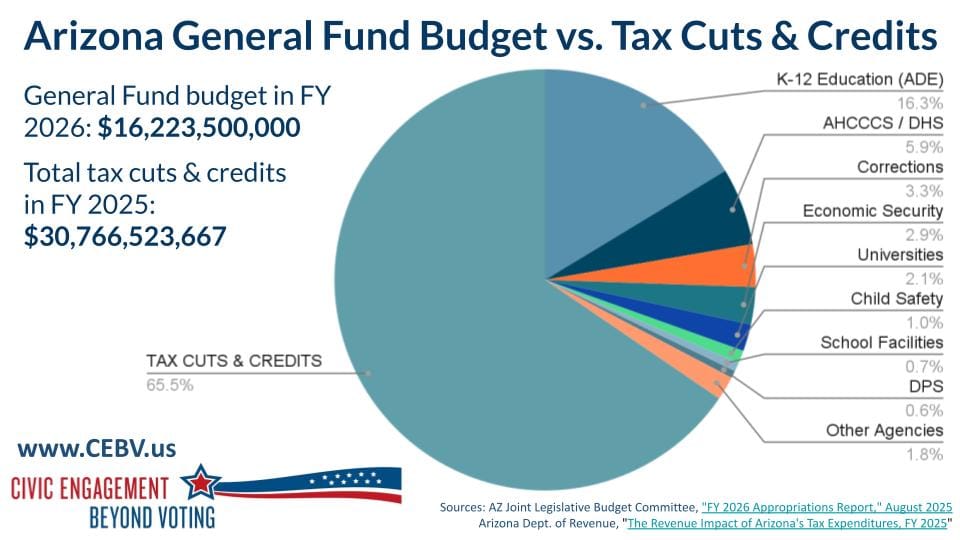 Our state disproportionately depends on sales taxes and federal payments. The former is regressive and impacts lower income people more; the latter will be reduced due to the One Big Crappy Bill. For some light reading, check out the Joint Legislative Budget Committee's January 2026 Monthly Fiscal Highlights as well as the JLBC's report on projected Federal Budget Reconciliation Bill—State Impact. Bottom line: conforming Arizona's taxes to the new federal policies will cost the state $1.45 billion over the next 4 years. This is currently the subject of a battle of chicken between the Republican-controlled legislature and the governor (Gov. Hobbs prefers partial conformity by excluding corporate and high-income tax breaks).