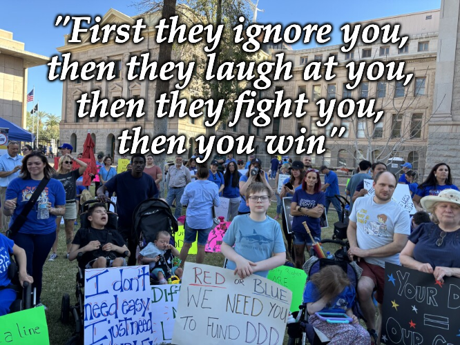 What happens next? DDD will run out of funds as soon as the end of this month, leaving families of ultra-high-need children high and dry — and, as we all know, nothing motivates lawmakers like a deadline. SB1734 and HB2945 face hearings on Tuesday in the House and Senate Appropriations Committees. These bills will likely proceed to votes of the full Senate and House this week, as Republican leadership is attempting to escape persistent negative press by fast-tracking the measures. Gov. Hobbs has signaled a veto, calling the bills "irresponsible and inhumane" and "pointless political theater." DDD families are pressing lawmakers to pass a “clean bill” — one that funds the program with no strings attached — and then work with them to build real, non-harmful DDD reform.