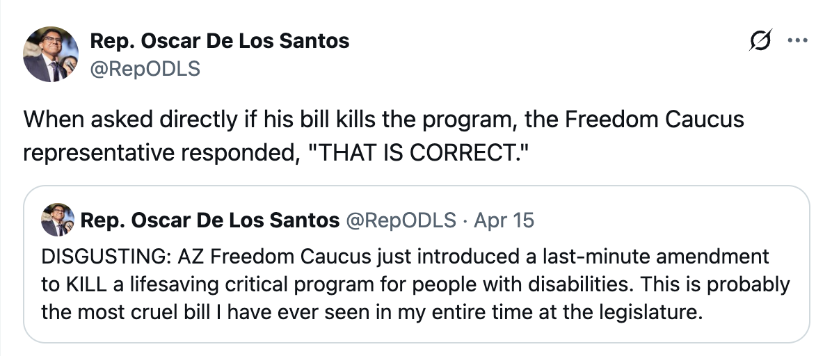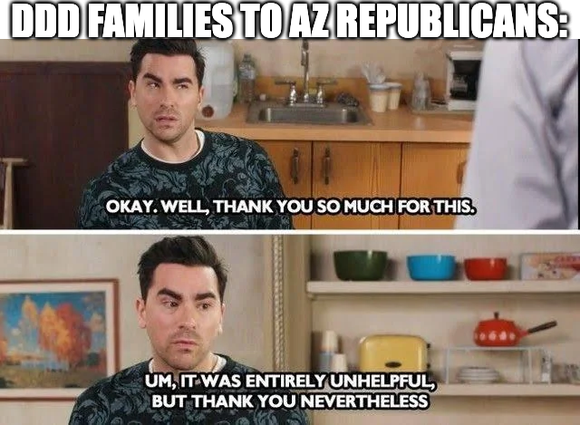 The governor doubles down. Gov. Hobbs has promised to veto every bill Republicans send her until the legislature passes a “reasonable, negotiated” bill to fund DDD. This moratorium is not only a baller move, but it’s been done before. Former Republican Gov. Doug Ducey did it in 2021.