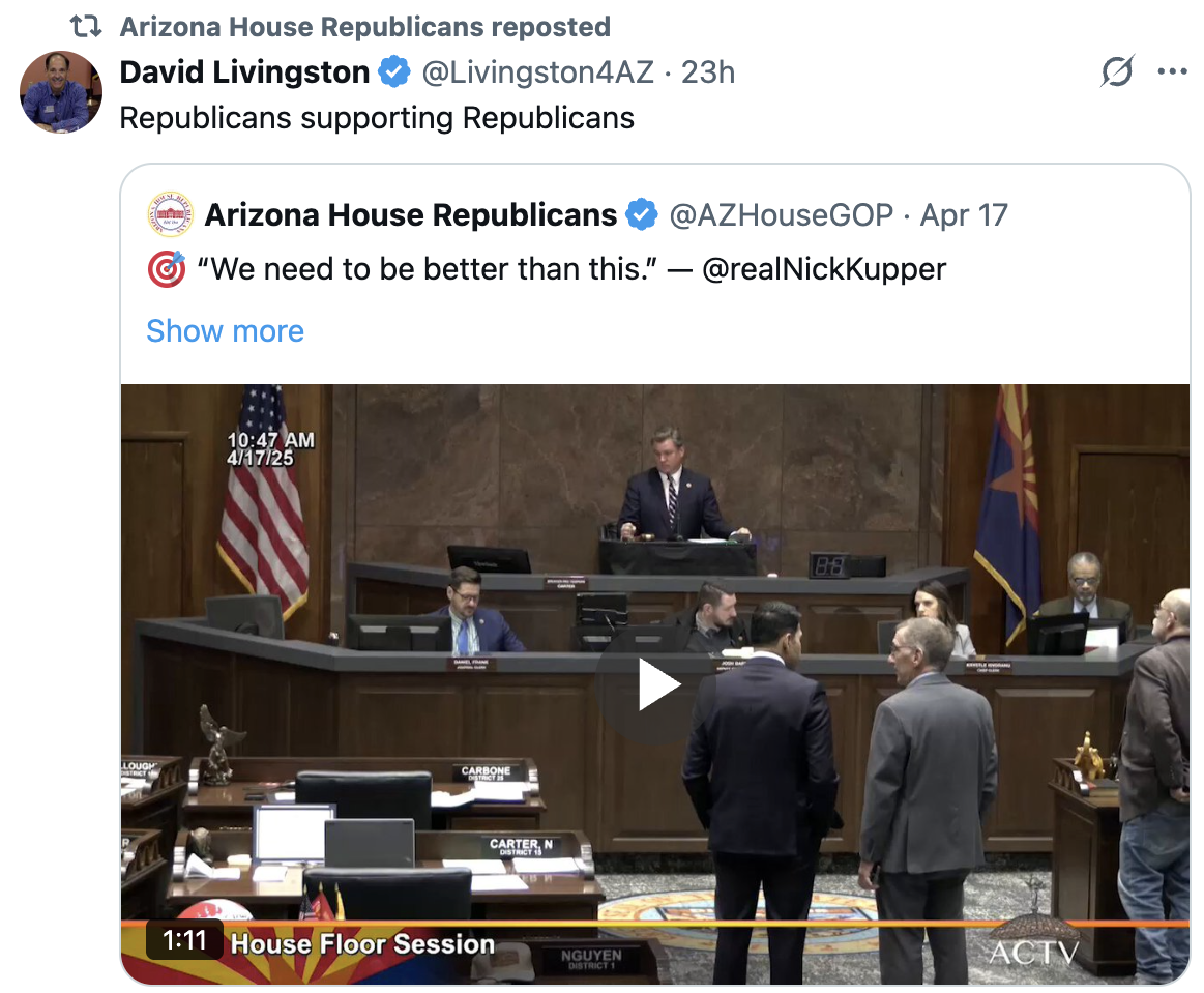Playing dirty. Democrats were unified in demanding a clean continuation of the program (no strings or gimmicks), but they were outvoted. Committee chair David Livingston (R-28) got permission from Speaker Steve Montenegro (R-29) to add three Republicans to the committee minutes before it began, which gave them enough Republican votes to kill any amendments not pre-approved by the committee chair. A spokesman for Gov. Hobbs noted that Livingston “couldn’t even pass his proposal through his own committee without stacking it full of political allies.” Livingston’s version passed by the narrowest of margins, 11-10.