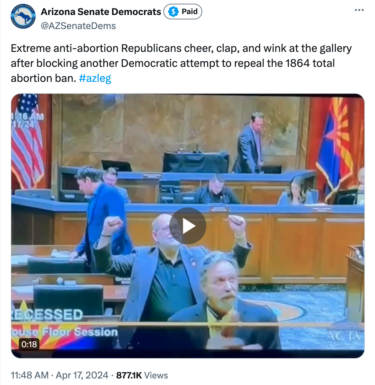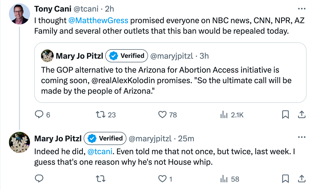 A new bill. On the Senate side, Anna Hernandez introduced her own repeal bill, SB1734. TJ Shope (R-16) and Shawnna Bolick (R-2), both in competitive districts, provided the necessary votes to allow her to introduce it. We well remember Bolick’s recent speech on the Senate floor vowing to introduce anti-abortion legislation “from the moment of conception,” and note that Bolick’s husband, Clint Bolick, was among the AZ Supreme Court justices hurling our state back to the 1860s.