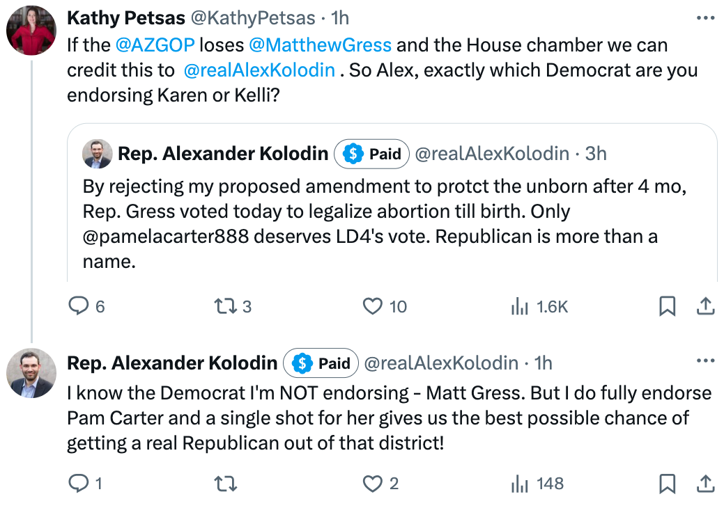 MAGA histrionics. During the vote and afterward, far-right lawmakers did everything but throw themselves to the funereal carpet in protest, comparing abortion variously to extremism, barbarism, slavery, and school shootings. Some even called for voters to oust their “RINO” colleagues: for example, Alexander Kolodin (R-3) publicly endorsed a “single shot” vote in Gress’s ultra-competitive district.