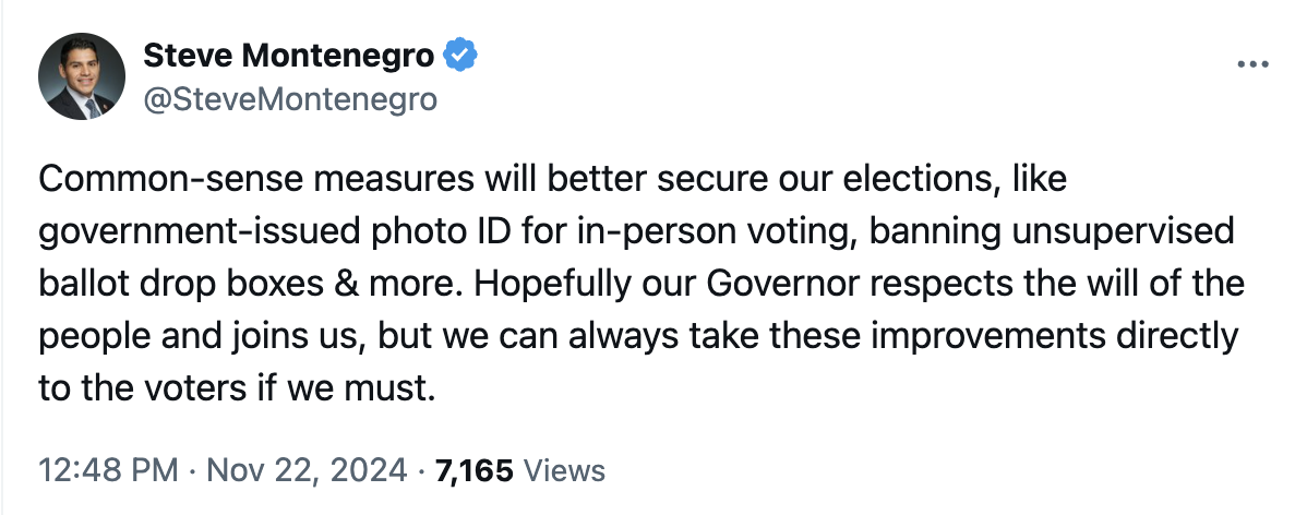HB2651, sponsored by Steve Montenegro (R-29), is a copy of a bill vetoed in 2023 that would ban all electronic voting equipment beginning in 2029 unless it meets Department of Defense cybersecurity standards, all pieces of it are made in the US, and the auditor general is given copies of the source codes. This type of equipment does not exist. Inspired by a baseless conspiracy theory about vote-flipping supercomputers. Held last week, but once again scheduled for House Federalism, Military Affairs & Elections Committee, Wednesday. OPPOSE.