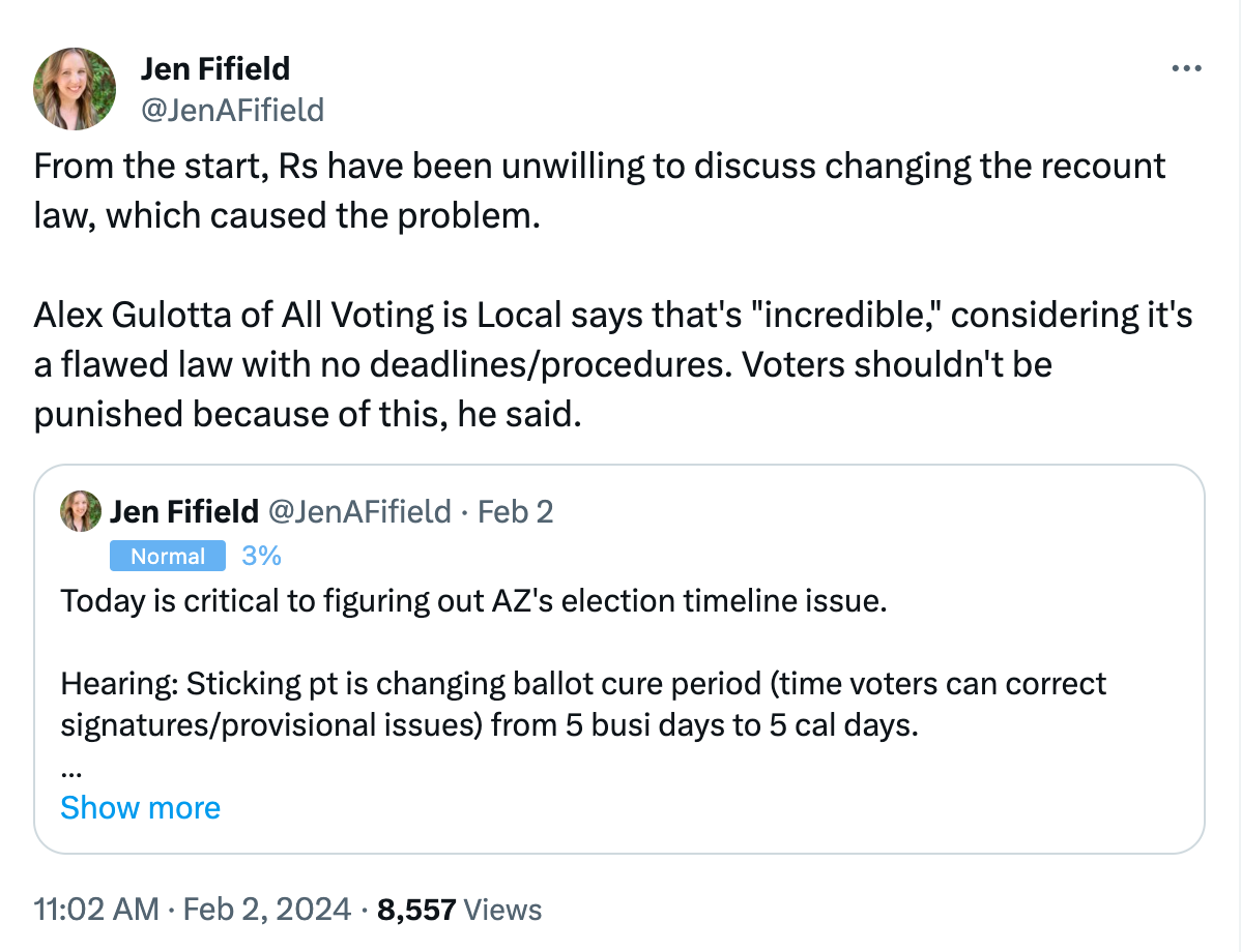 A solution to Arizona’s elections timeline issue may be close at hand. County officials have said they need 19 extra days to prepare ballots in order to avoid disenfranchising overseas and military voters. (Here’s a good Twitter thread from Pima County Recorder Gabriella Cázares-Kelly that explains the issue.) Watch for a proposal to be introduced on Monday that gets officials those extra days without making any of the other unnecessary changes some MAGA lawmakers are demanding.