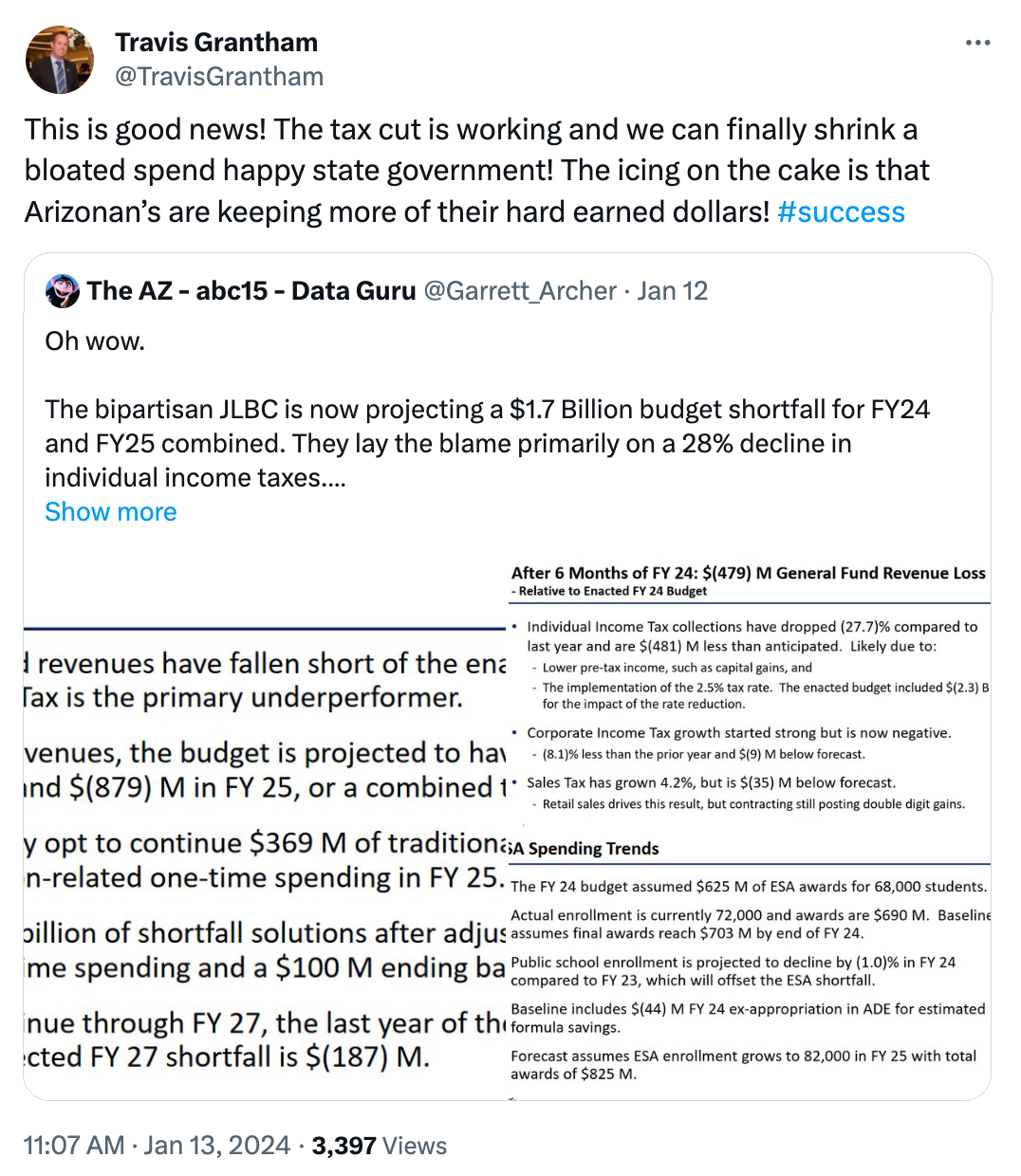 On Friday, the nonpartisan analysts at the Joint Legislative Budget Committee dropped a bombshell on the fledgling 2024 session with their forecast of a jaw-dropping $1.7 billion deficit over this year and next year. Arizona is facing skyrocketing expenses and plummeting revenues thanks to two Ducey-era boondoggles: a massive tax cut for the rich and a ballooning universal ESA voucher program.