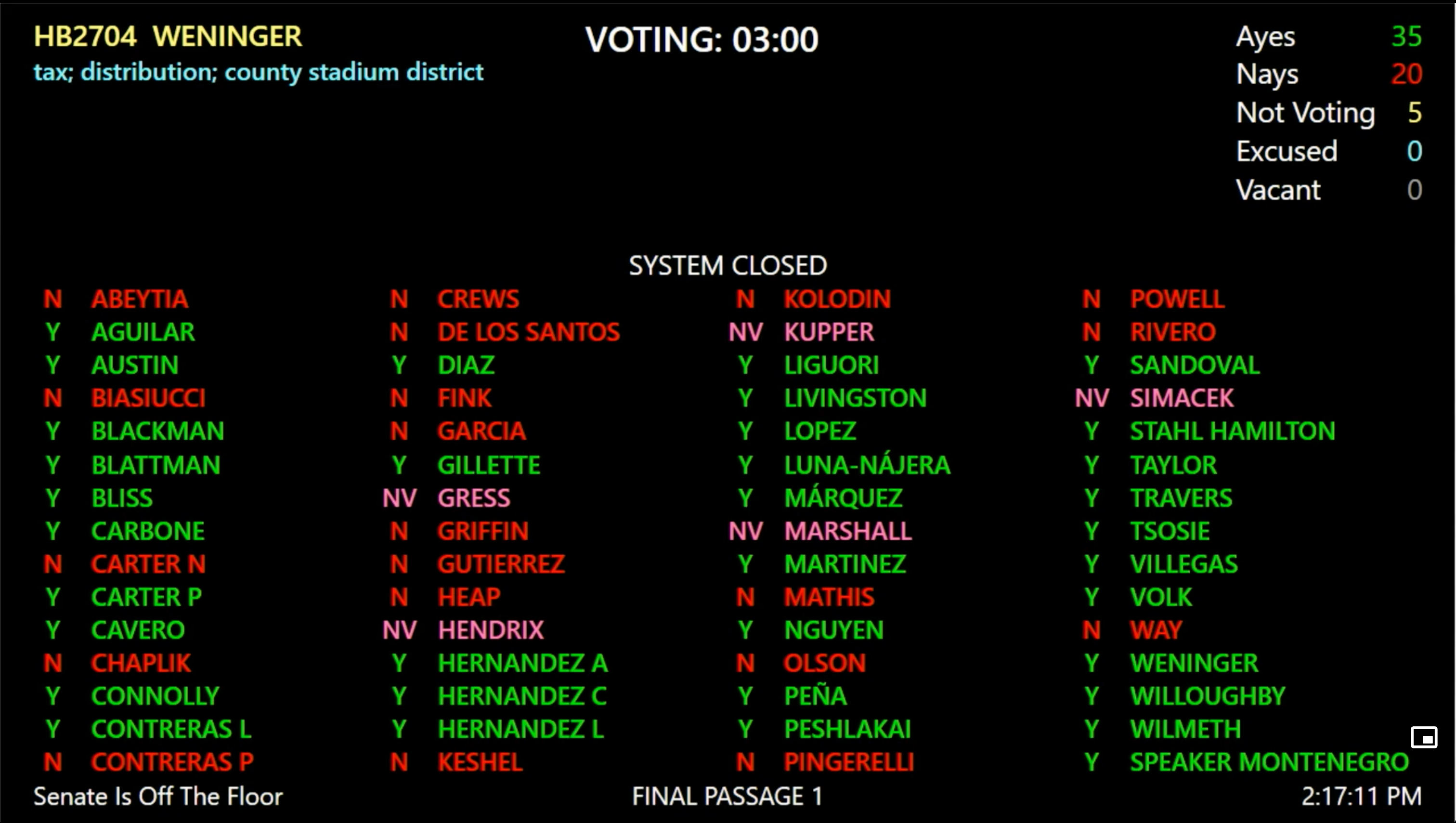 Accepting defeat. Sulking, the House first read the Senate budget on Wednesday, voted to dispense with the 3-day requirement, and passed it on Thursday. Even as the House votes were just getting under way, the Senate shared on social media that the two sides had finalized a deal. The bills had broad support; each budget bill passed with between 40 and 42 yes votes. Accepted amendments were very minor; hostile floor amendments from fringe Republicans (such as the one just below) all roundly failed.