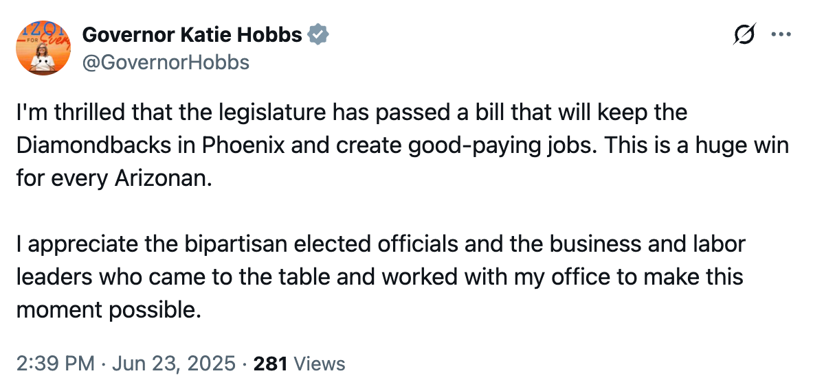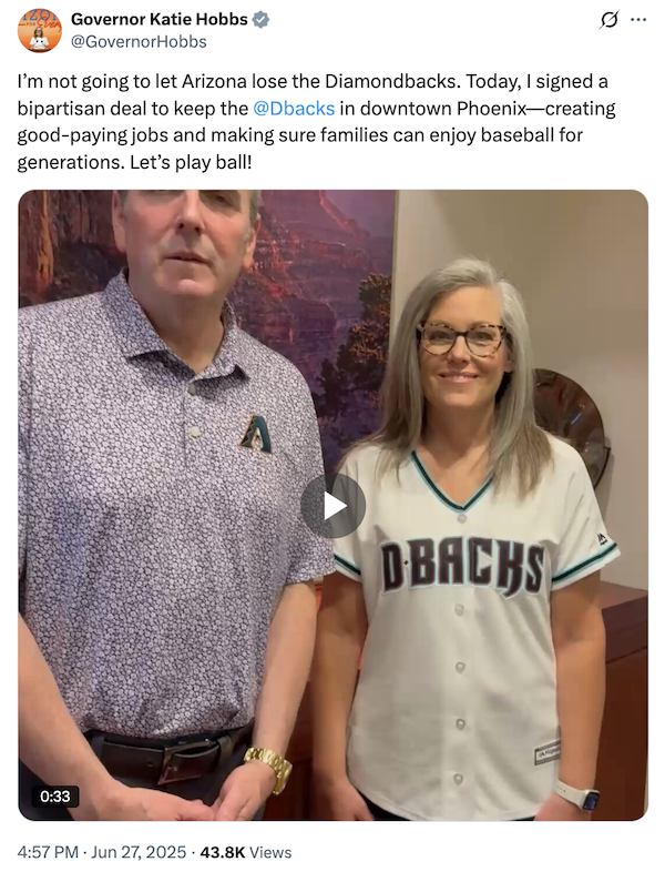Vetoed. As promised, Gov. Hobbs vetoed both sham budgets within moments of their being transmitted to her office. Hobbs now holds a new record for the most vetoes in any legislative session: a jaw-dropping 169 bills. (She’s rightly proud of the record.)
