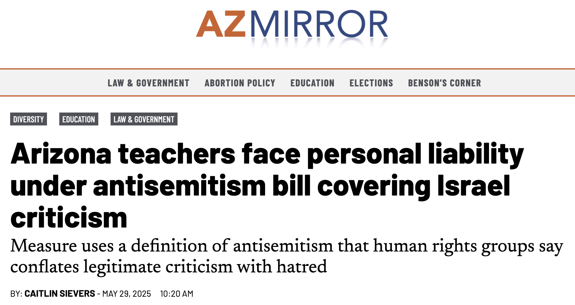 • Encourages censorship. HB2867 defines "antisemitism" in part as creating "a hostile educational environment." This is coded language for avoiding any discussion that deals with thought-provoking or difficult subjects, and that encourages censorship. In Arizona, our educational environments should promote robust classroom discussion and critical thinking, and students must explore complex issues to be prepared for a complex world.