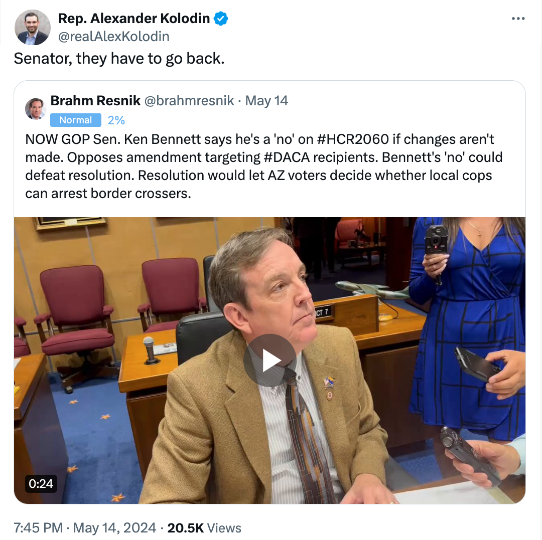 ⏰⏰ If you have 10 minutes: Contact Sen. Ken Bennett (R-1) to thank him for insisting that any border bill that makes it to our ballots be reasonable and to ask him to hold firm on HCR2060: 602-926-5874 / kbennett@azleg.gov.