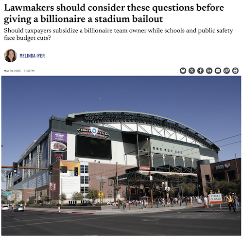 ⚠️ The bad: stadium giveaway in the budget. Lawmakers’ pay-to-play billionaire stadium giveaway, currently stalled amid an outpouring of fierce public opposition, may get stuffed into the budget. This practice of lumping together various potentially unrelated provisions, known as “logrolling,” is intended to effectively force lawmakers to support measures they would otherwise oppose. Apparently, ramming through a stadium scheme is a continued high priority for Gov. Katie Hobbs and her staff — which means they need to hear from us.