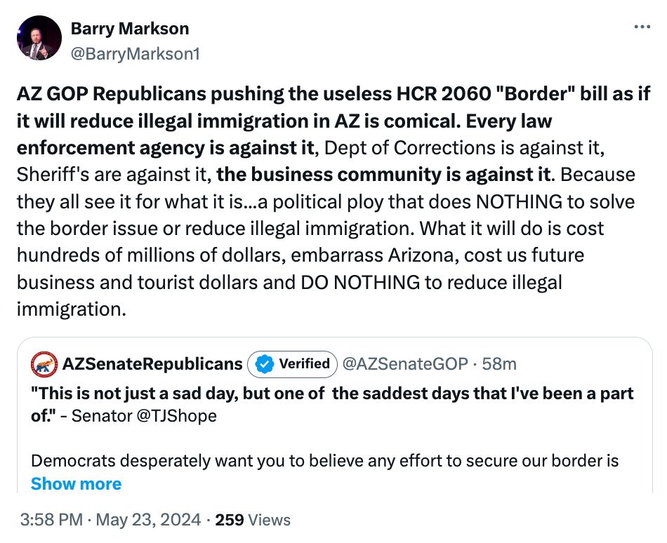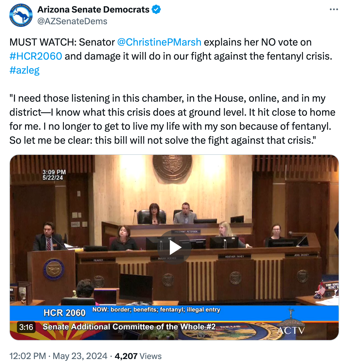 If that wasn’t enough, in the clearest possible sign that HCR2060 is designed only to score cheap political points, the Arizona Republican Legislative Victory PAC (which exists to prop up and maintain a Republican majority) has already started running ads attacking lawmakers in competitive districts for refusing to support the measure. Sen. Christine Marsh (D-4), one of the targets of those ads, lost a son to an accidental fentanyl overdose. Attacking her for opposing a bill that “addresses the fentanyl crisis” is a pretty clear sign the bill doesn’t do what Republicans are trying to say it does.