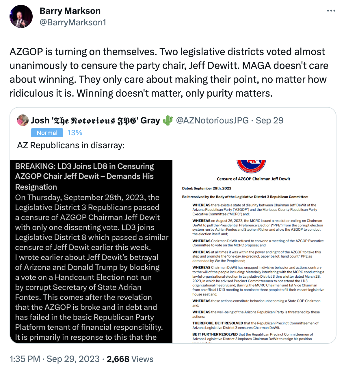 And they show no sign of correcting course. Arizona Republicans are censuring and suing each other. Republican elected officials continue to turn off voters by running their mouths. Failed grifter / MAGA acolyte / perennial bad penny Kari Lake is poised to declare a bid for US Senate. And they’re still filing endless lawsuits, clogging our courts and wasting our money with their laughable fiction of “rigged” and “stolen” elections rather than doing the hard work of considering why exactly it is they’re losing.