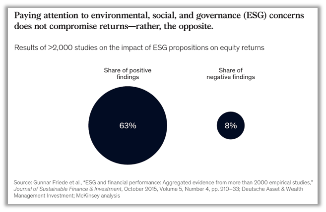 What business doesn’t want to endure and prosper for decades to come? Long-range strategy includes factoring in results beyond the next quarter. Firms are realizing that avoiding boom-and-bust cycles requires mitigating risks such as climate change, employee turnover, and slipshod management. According to the investment firm McKinsey, “The overwhelming weight of accumulated research finds that companies that pay attention to environmental, social, and governance concerns do not experience a drag on value creation—in fact, quite the opposite.”