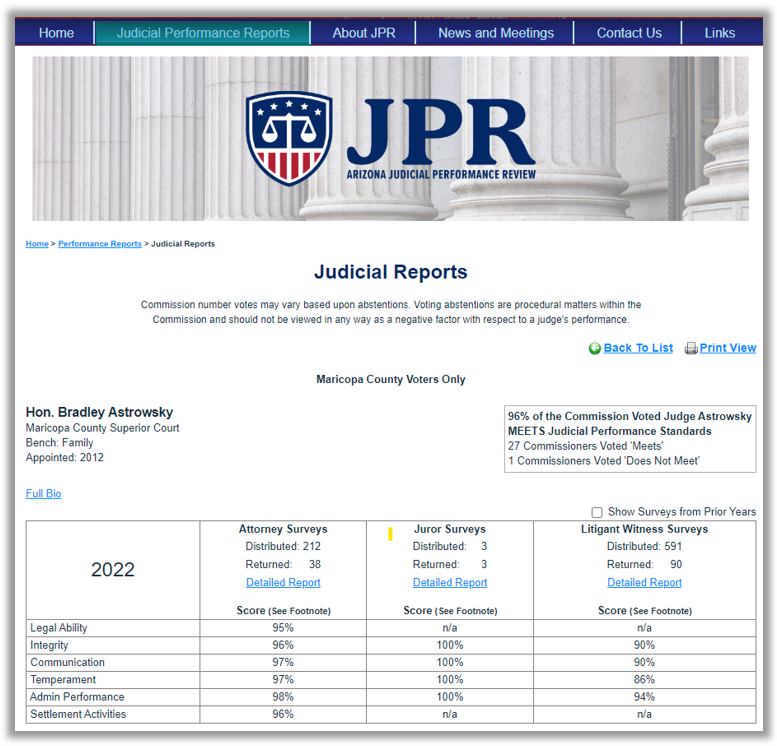 One such judge, Stephen Hopkins, was rated “Does Not Meet” in 2022. However, his publicly available ratings raised no major red flags (although he had previously been reprimanded by the Commission on Judicial Conduct for rude courtroom conduct, which would have taken digging to discover). It can only be guessed that private information led to the decision, with 15 out of 22 commissioners deciding he didn’t meet JPR standards. Abe Kwok wrote in the Arizona Republic, “The performance-review process itself could use greater transparency and explanation.”