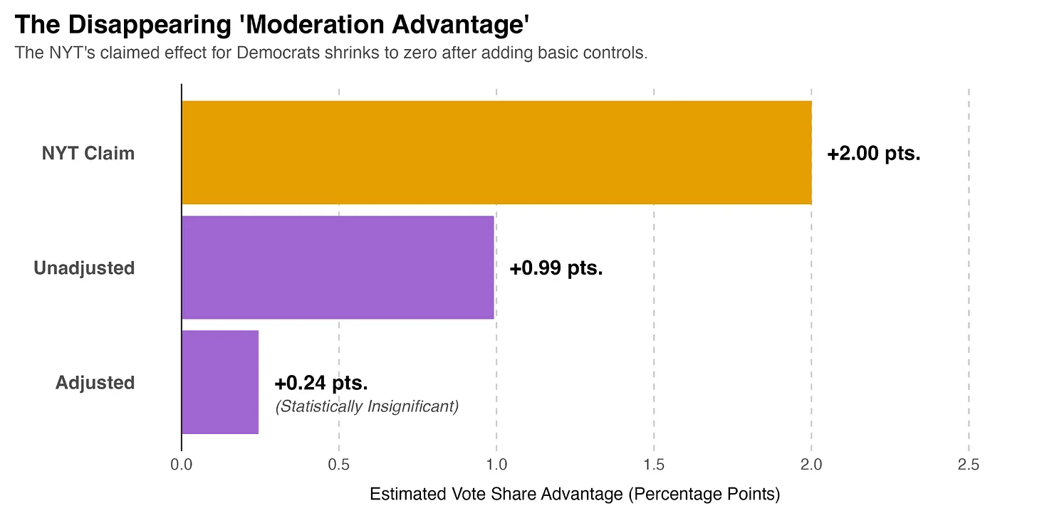 When you factor out the corrupting variables of money and incumbency, the supposed electoral bonus for moderate candidates vanishes entirely. In other words, "centrism" does not actually win more elections.